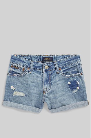 These shorts achieve a playful warm-weather look with lightweight, indigo-dyed cotton and patchwork repairs.