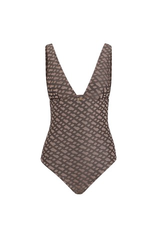 Jednodijelni kupaći kostim iz kolekcije BOSS izrađen je od rastezljive tkanine s uzorkom monograma i dizajniran s dubokim izrezom na stražnjoj strani i oblikovanim košaricama. Odjevni predmet izrađen je od najmanje 60% recikliranog poliestera. Reciklirani poliester je umjetno vlakno napravljeno od otpada na bazi ulja kao što su stare PET boce.