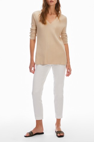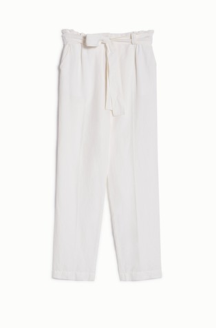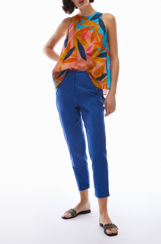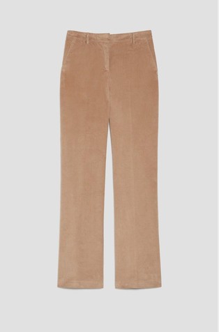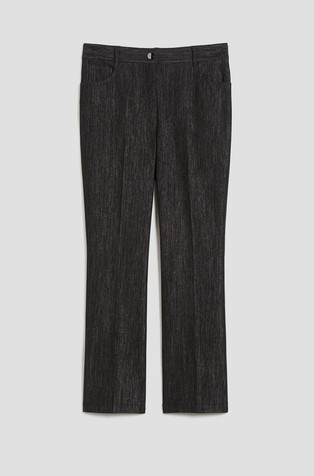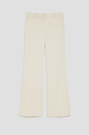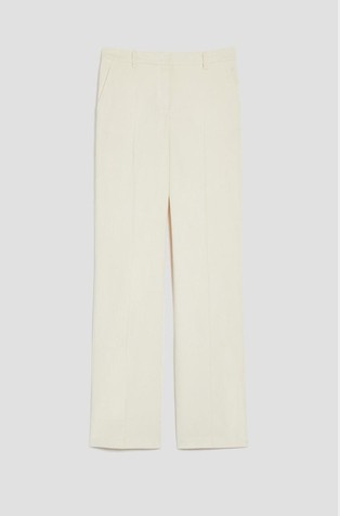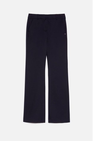 Hlače od rastezljivog pamučnog satena s mekom površinom. Dizajnirane su s uskim krojem od struka do koljena i uz blago zvonaste hlače. Kroj je elegantno nadograđen dvostrukim prekriženim petljama za remen.
